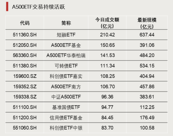 近期,A500ETF、科创债ETF等热门品种交易持续活跃。