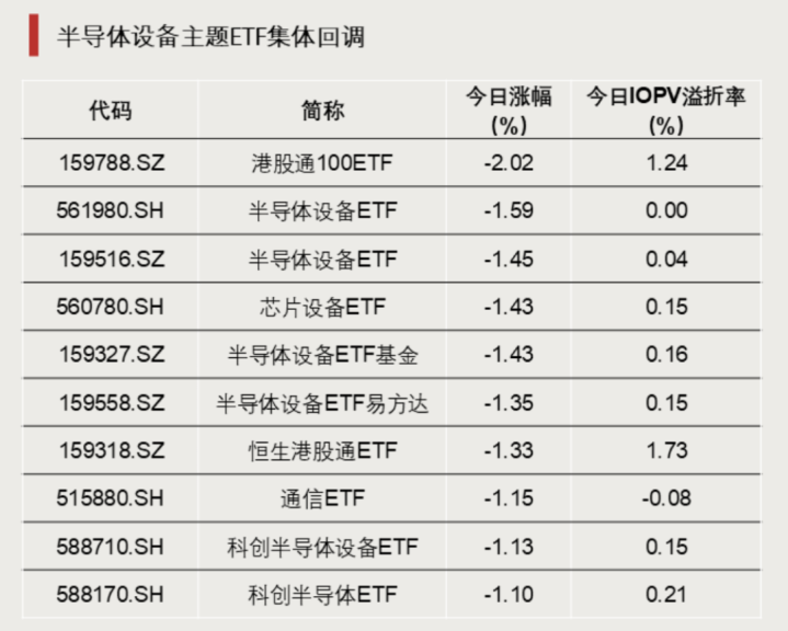 半导体设备、光模块等科技板块今日表现较弱,多只跟踪半导体材料设备、中证半导、通信设备等指数的ETF跌超1%。
